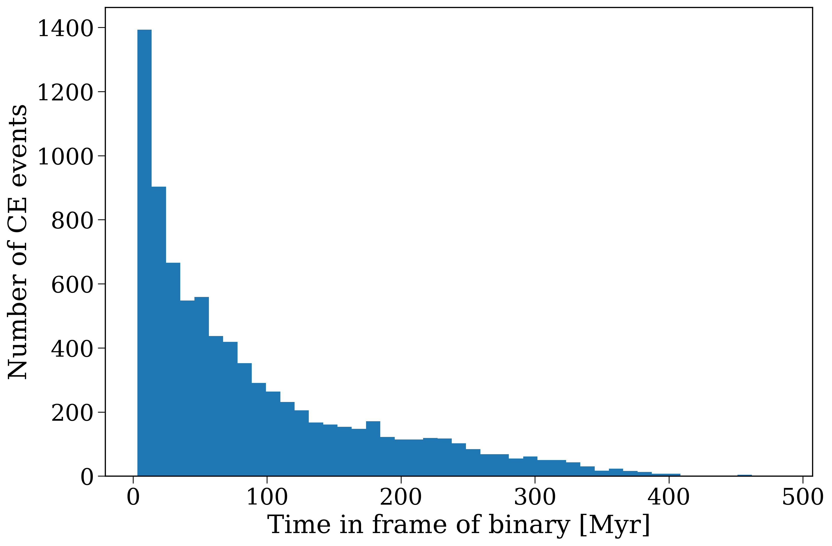 Now make a histogram that shows the distribution of common-envelope event times in the frame of the binary.