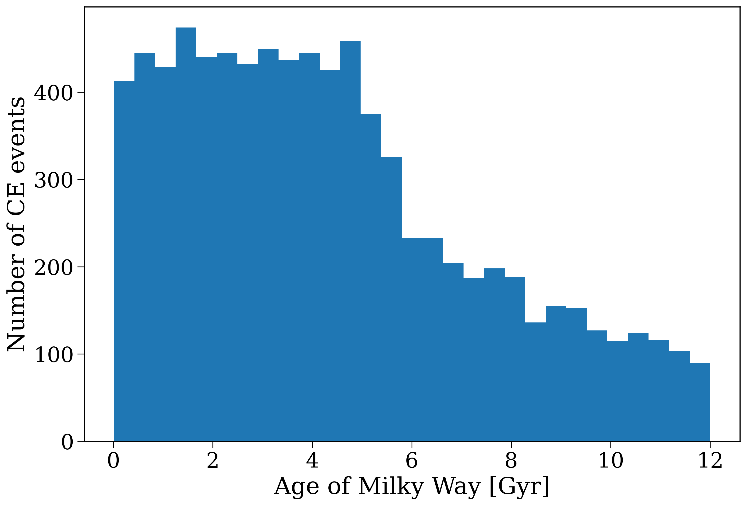 The timing in the frame of the binary is relatively short on the scale of the galaxy (most occur within 100 Myr, see earlier plot). So the main driver of the distribution on galactic timescales is the star formation history of the galaxy. In this case, we have a Milky Way-like SFH, which means that most stars (and therefore most common-envelope events) occur early on in the galaxy’s history, which is why we see a peak at early times in the histogram.