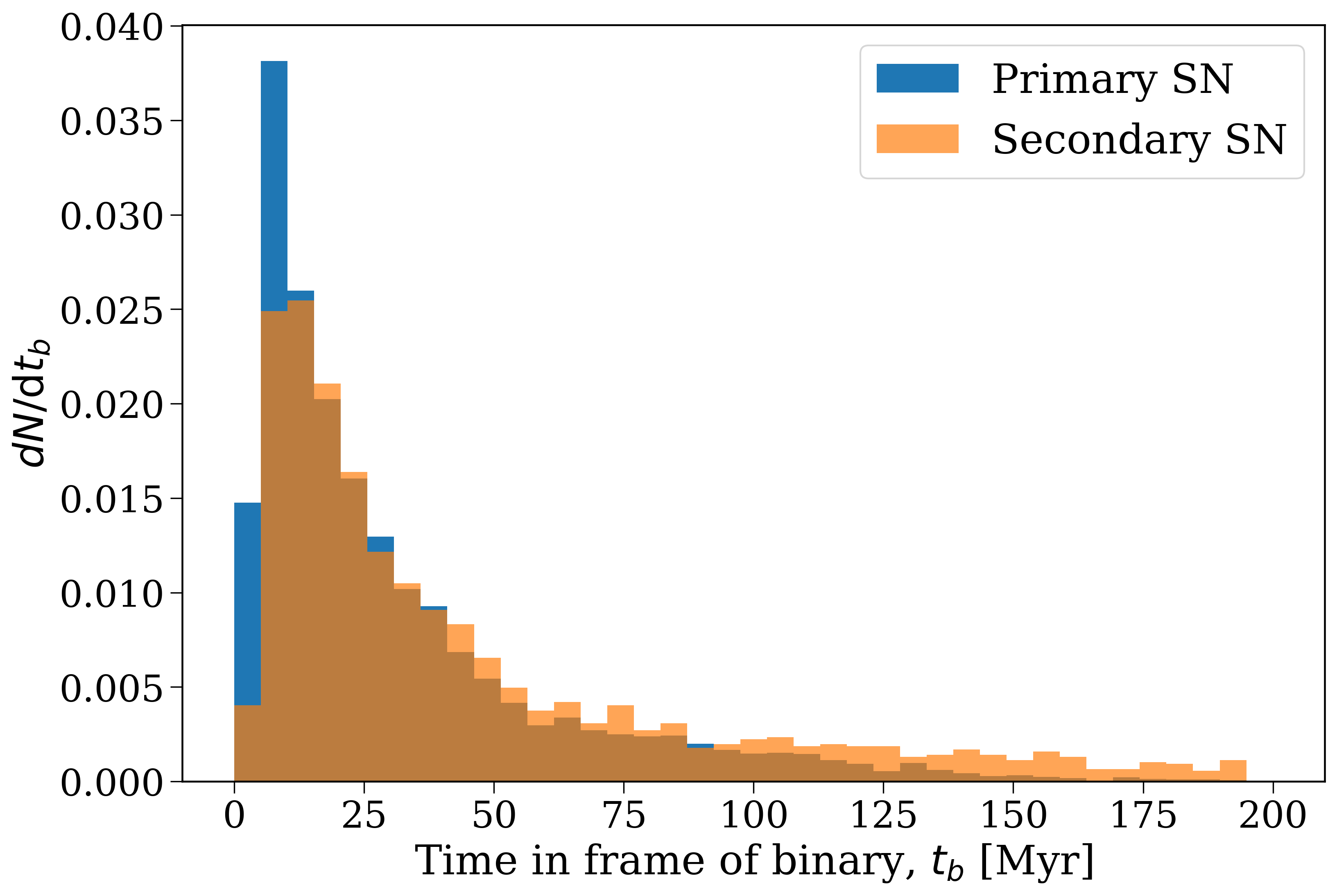 Distribution of supernova times in the frame of the binary, with primary and secondary supernovae shown separately.#