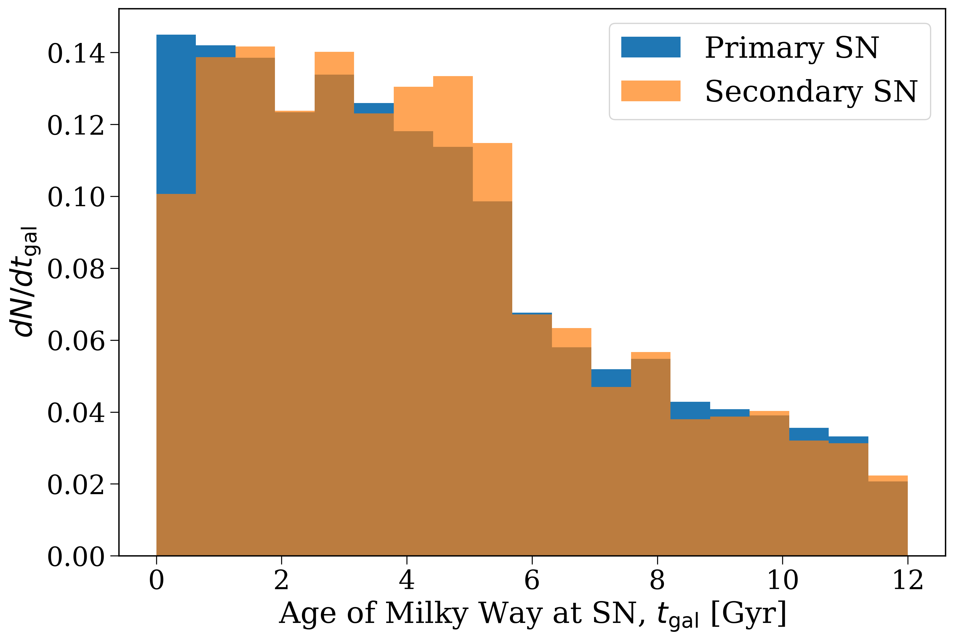 Distribution of supernova times in the frame of the galaxy, with primary and secondary supernovae shown separately.#